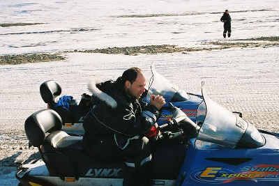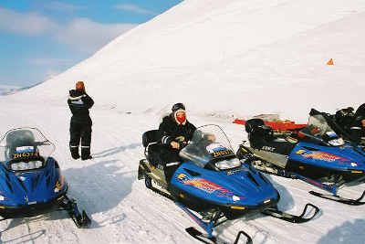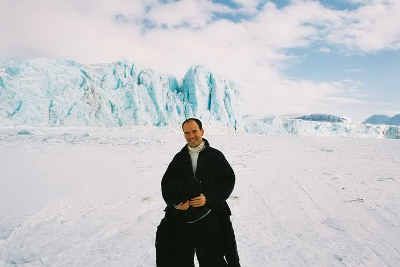 February, 2004: Before I start moving forward, a little backtracking. I spent the 2000-2001 academic year as Fulbright Scholar in Norway. My job was a "roving scholar" attached to the Royal Norwegian Ministry of Education. I traveled throughout the country and lectured on various topics in American culture. I saw nearly every part of Norway in those ten months. One of the best trips I took was to Svalbard, an archipelago in the Arctic Ocean (78 degrees north), approximately 600 miles south of the North Pole, which is farther north than even Barrow, Alaska. My friend Jon and I took a snowmobile trip across the frozen Tempelfjorden. Each of us had to handle our own snowmobile. I did pretty well, except for when I got stuck in a little valley and our guide had to drive me up the bank. I got mine going about 100 km/hour. These are some images of the Tunabreen (the blue glacier) and of me on the snowmobile I drove.